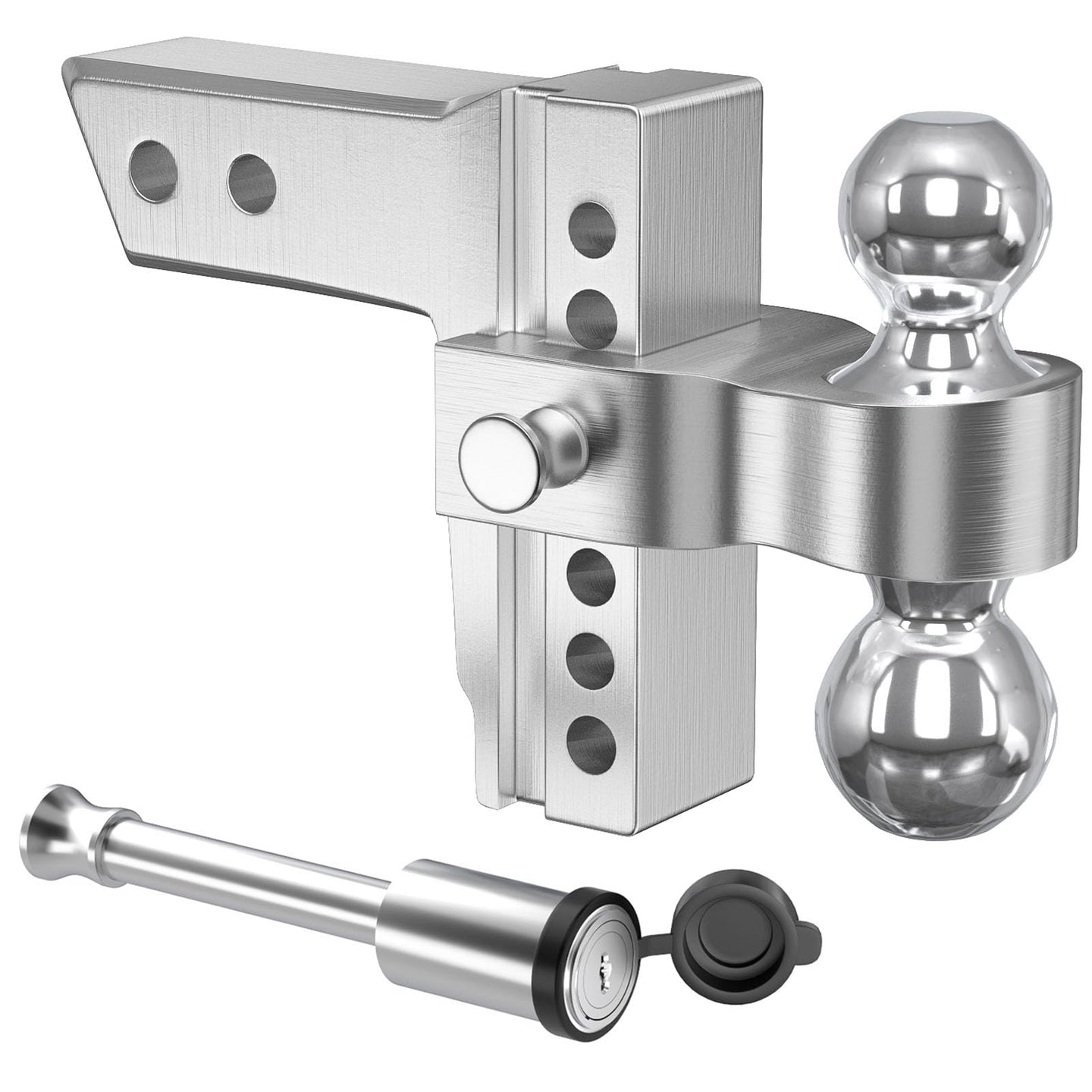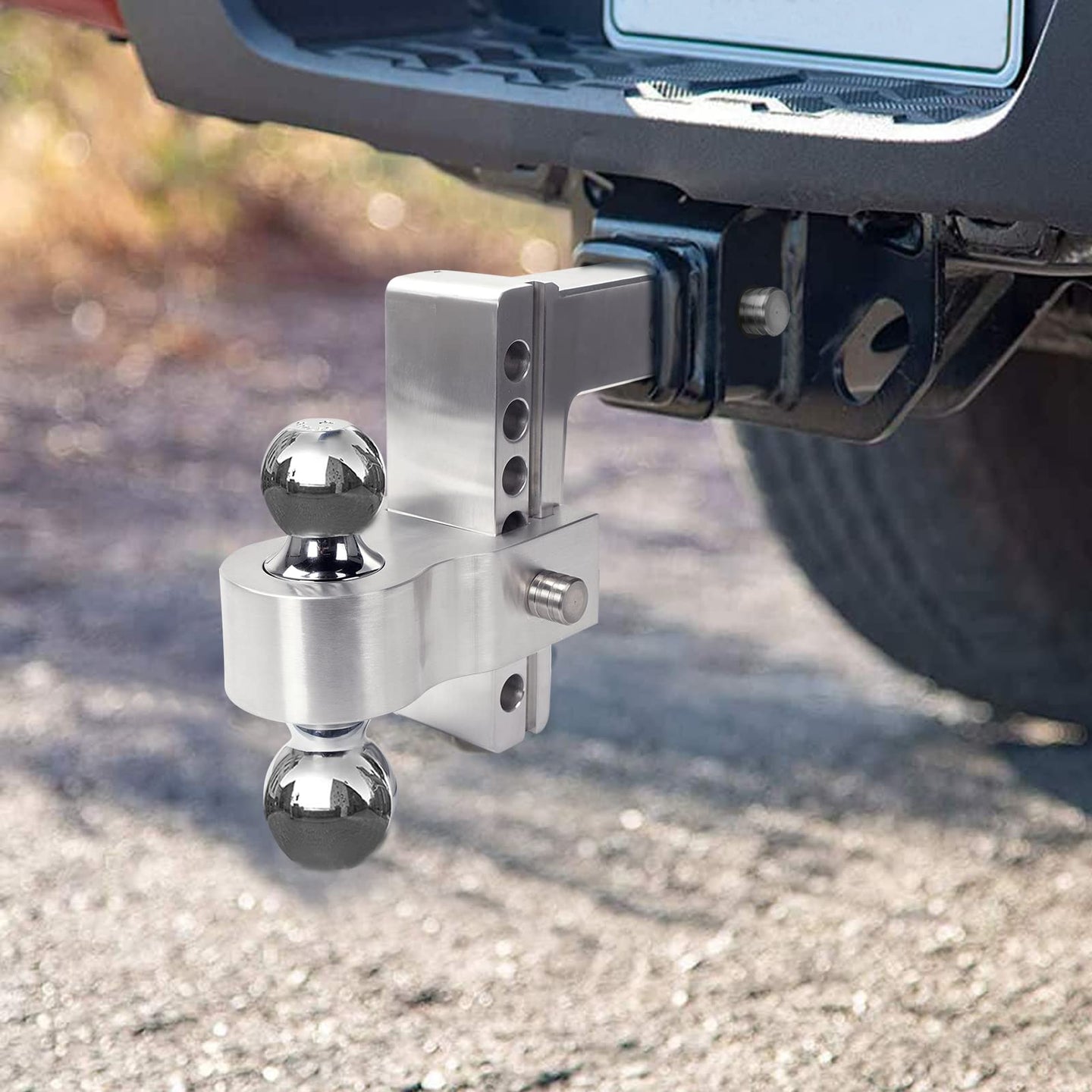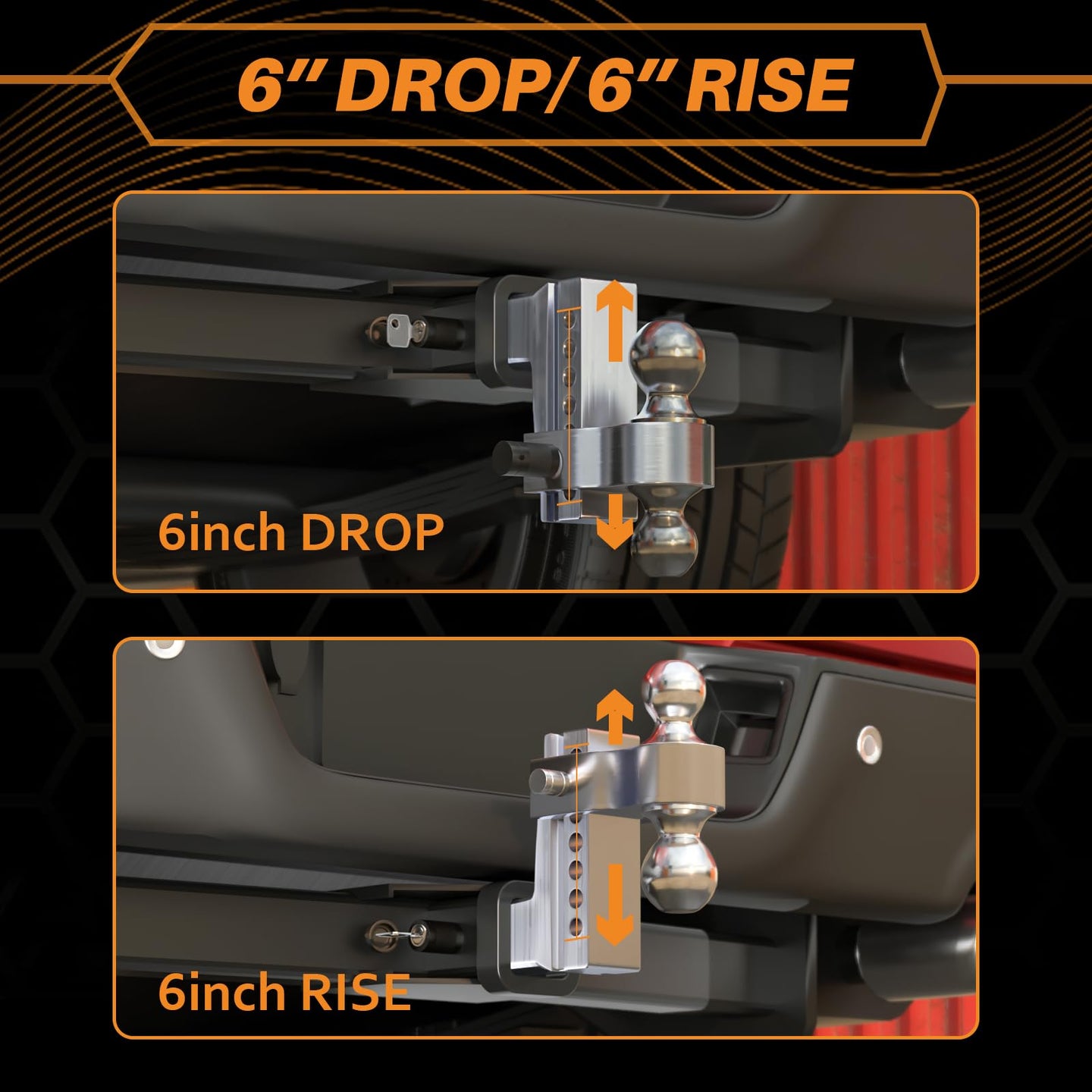 - 🚙【Adjustable Ball Mount】This ball hitch enables precise and rapid 6" drop & 6" rise can be easily adjustable for optimal towing to maintain vehicle departure angle, ensuring a level and stable towing configuration. Height adjustment to accommodate trailers of different heights, you get the perfect fit for any trailer height with no need to ever change hitches for different vehicles.