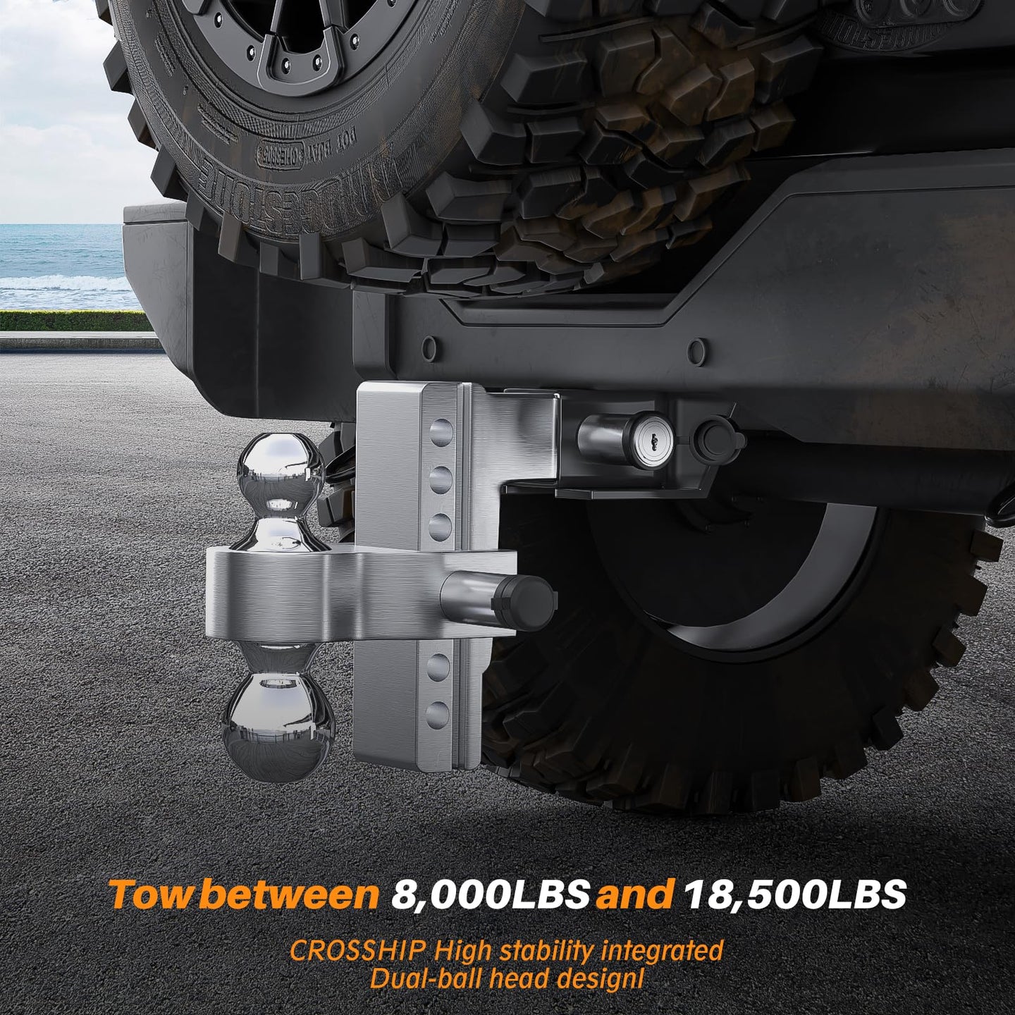 - 🚙【Dual-Balls Integrated Design】Integrated hitch balls allow for supreme towing capacity, after professional laboratory evaluation, the 2-inch ball is rated for a capacity of 8000 lbs, and the 2-5/16-inch ball for 18,500 lbs, so you can haul heavier loads such as heavy trucks or RVs with ease. ATTENTIONS: Do not exceed the capacity of hitch receivers or towed vehicles, since the car vehicle and trailer track independently, a slight wobble is normal.