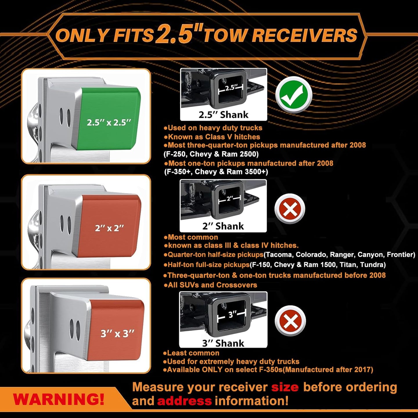 - 🚙【Compatibility 2.5-inch receiver】Our standard 2.5-inch receiver hitch is compatible with a wide range of connectors, including trailer, rear bumper, or agricultural machines and dual receiver extender. Also aluminum Shank can be adjusted according to the depth of your need. This tow hitch is ideal for hauling boats, trailers, truck, campers, rear bumper, horse, RV/ATVs trailers, motorcycles, etc.