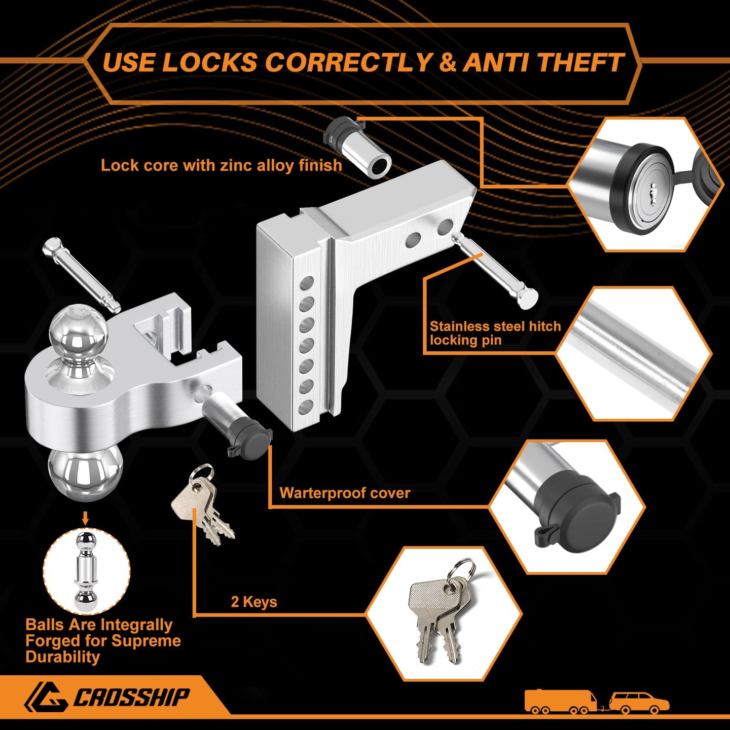 🚙【Safe and Easy】This adjustable trailer hitch allows you to quickly assemble and switch between trailers in seconds. Each trailer hitch includes a combination of two sets of locks and keys to secure the ball mount platform and the hitch, not only adding Safety, also provides a part of the security theft function, so you can enjoy convenience and peace of mind on the road. Best trailer hitches that you can focus on the road ahead and never worry about what's behind.