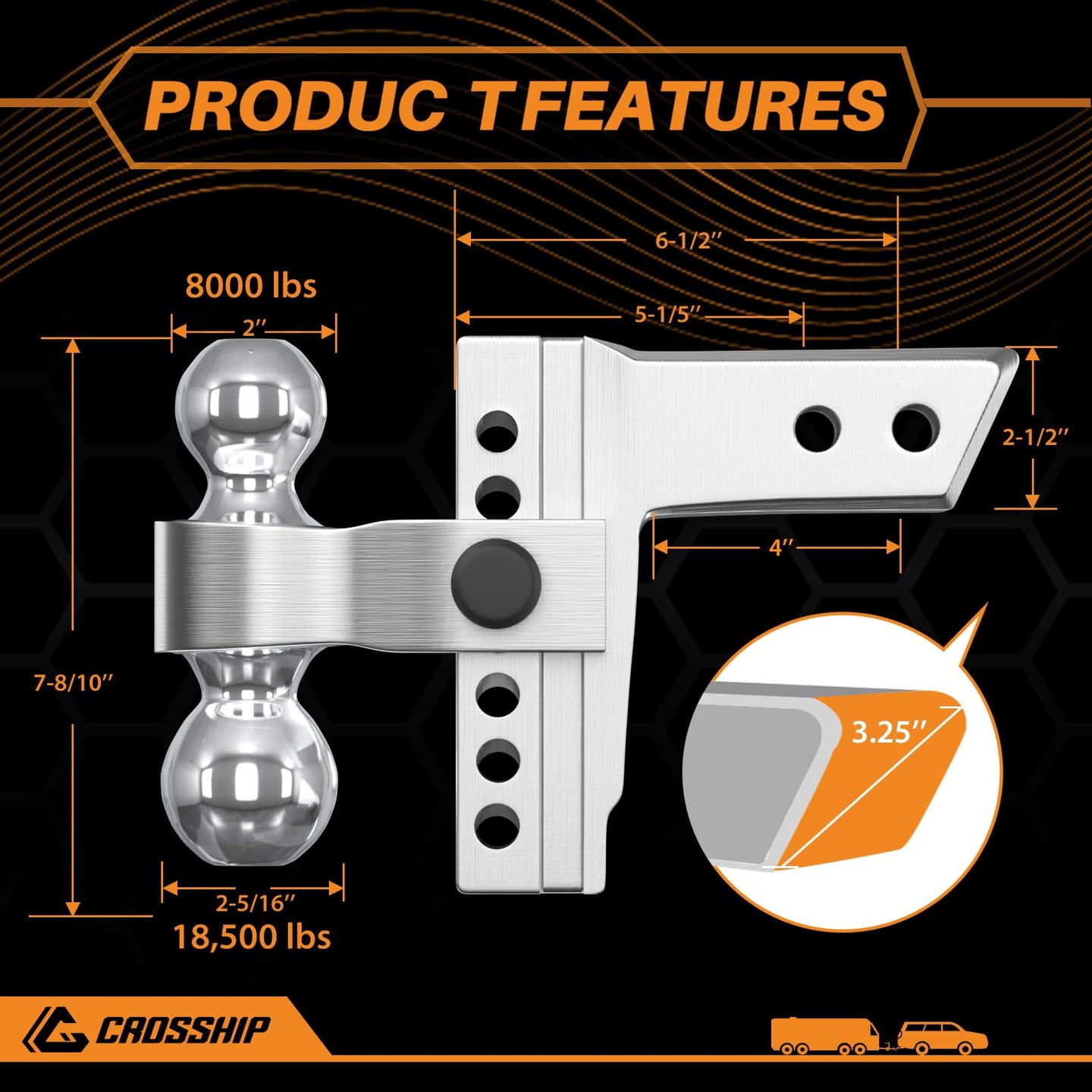 CROSSHIP Adjustable Trailer Hitch Ball Mount-Fit 2.5" Receiver, 8 Inch Drop/Rise Aluminum Drop Hitch with 2'' & 2-5/16'' Solid Dual Balls 18,500 LBS GTW-Tow Hitch for Heavy Duty Truck with Double Lock