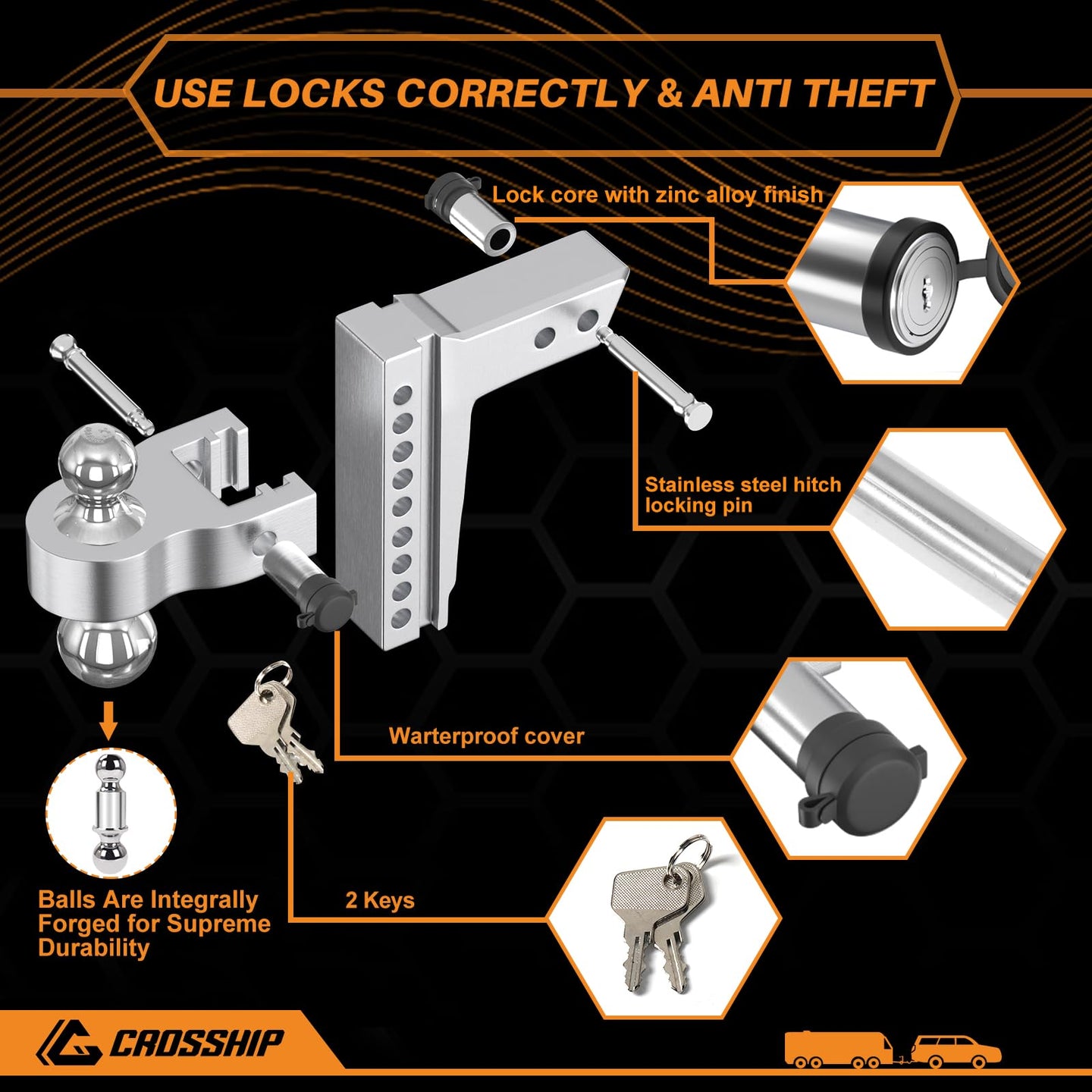 🚙【Safe and Easy】This adjustable trailer hitch allows you to quickly assemble and switch between trailers in seconds. Each trailer hitch includes a combination of two sets of locks and keys to secure the ball mount platform and the hitch, not only adding Safety, also provides a part of the security theft function, so you can enjoy convenience and peace of mind on the road. Best trailer hitches that you can focus on the road ahead and never worry about what's behind.