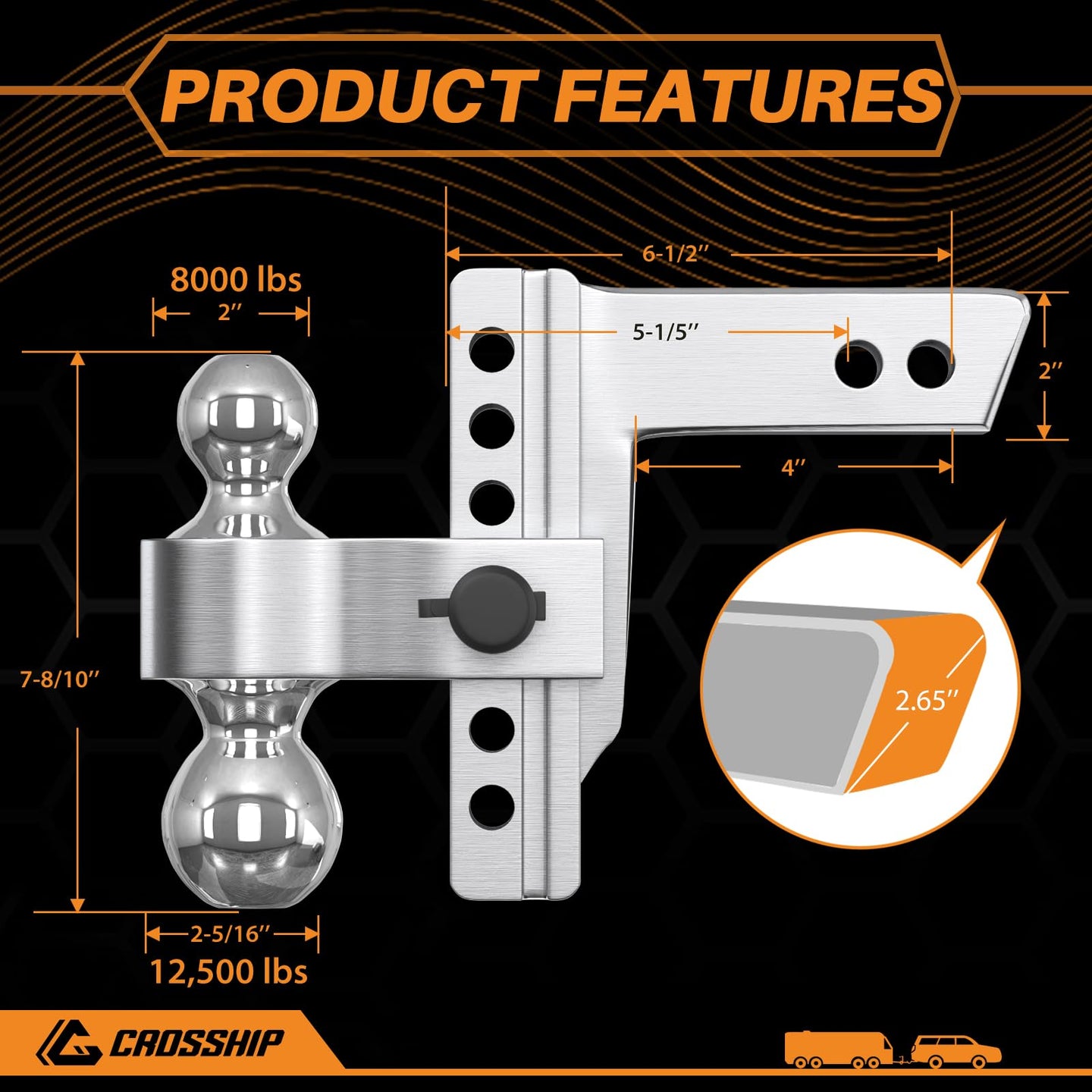 CROSSHIP Adjustable Trailer Hitch Ball Mount-Fit 2" Receiver, 8 Inch Drop/Rise Aluminum Drop Hitch with 2'' & 2-5/16'' Solid Dual Balls 12,500 LBS GTW-Tow Hitch for Heavy Duty Truck with Double Locks